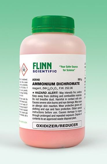 Special Hazard Alert: The experiment or demonstration is a popular use of ammonium dichromate. When heated to decomposition, ammonium dichromate produces nitrogen, water and chromium(III) oxide. Chromium compounds are known carcinogens. Because of this risk, the demonstration should be conducted under a well-ventilated hood or outdoors. This demonstration should never be done in a closed, poorly ventilated room. Strict hygiene should be observed before and after the combustion.