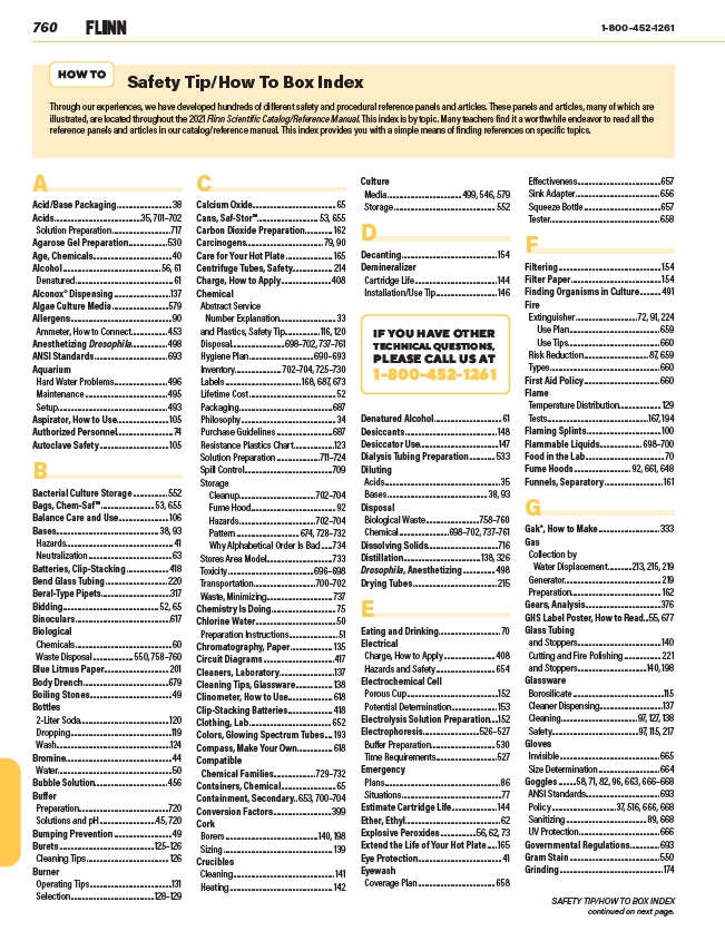 illustrated, are located throughout the 2021 Flinn Scientific Catalog/Reference Manual. This index is by topic. Many teachers find it a worthwhile endeavor to read all the