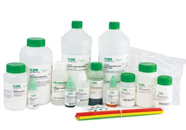 Chemicals Provided: Hydrochloric acid, acetic acid, sodium acetate, sodium chloride, sodium bicarbonate, sodium carbonate, ammonium hydroxide, ammonium chloride, phenolphthalein solution, bromthymol blue solution, alizarin yellow R solution.
