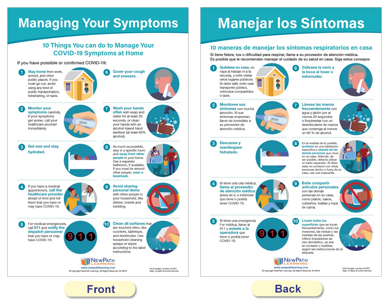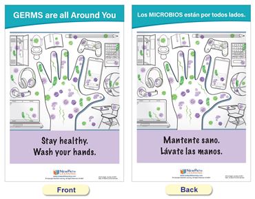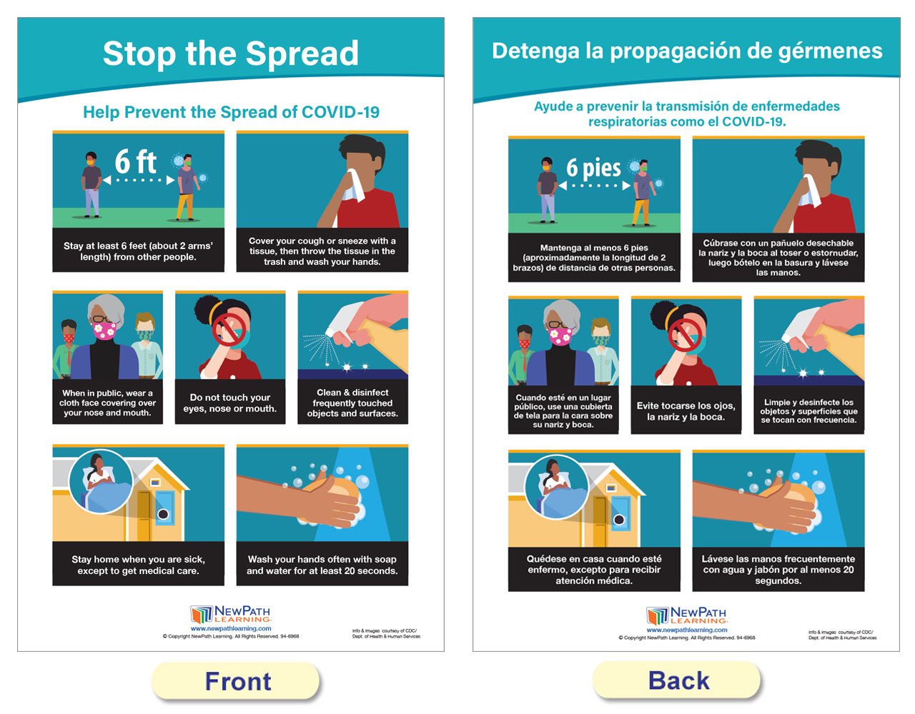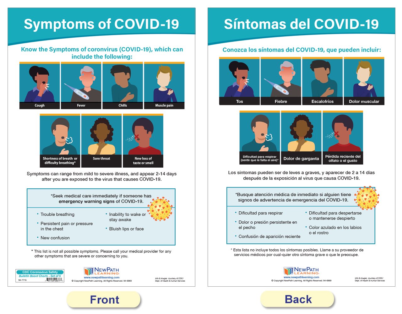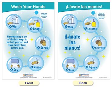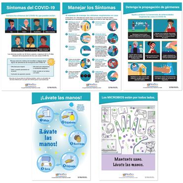 Each 18” x 12” chart is double-sided and laminated. One side provides illustrated safety information in English, and the reverse side in Spanish. Set includes the following 5 double-sided, laminated charts: Symptoms of COVID-19; Managing Your Symptoms; Stop the Spread; Wash Your Hands; and Germs are all Around You!