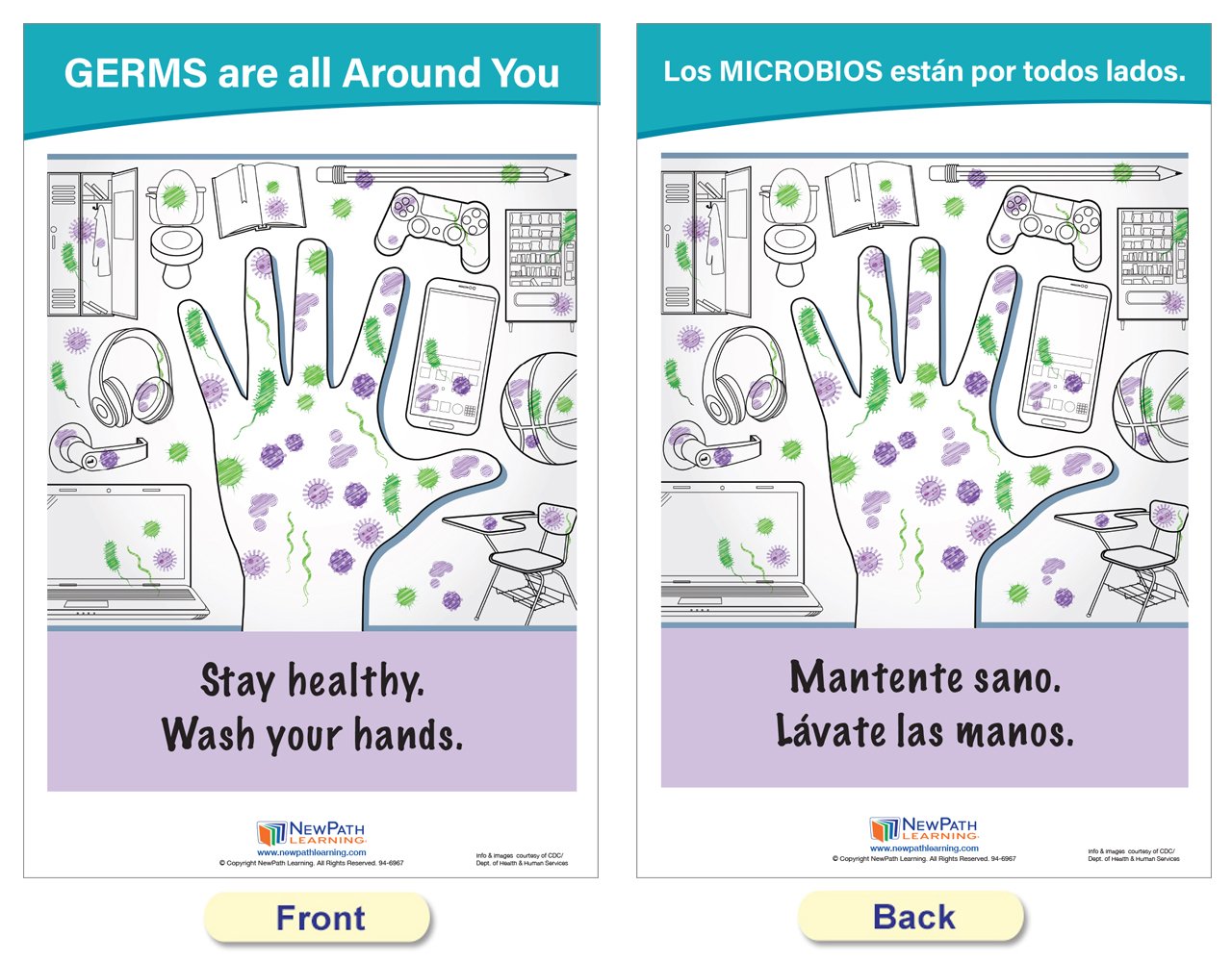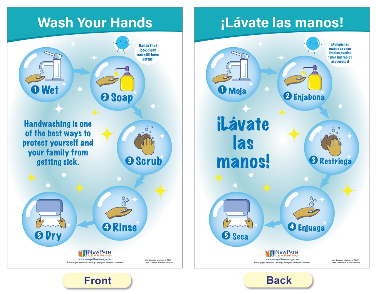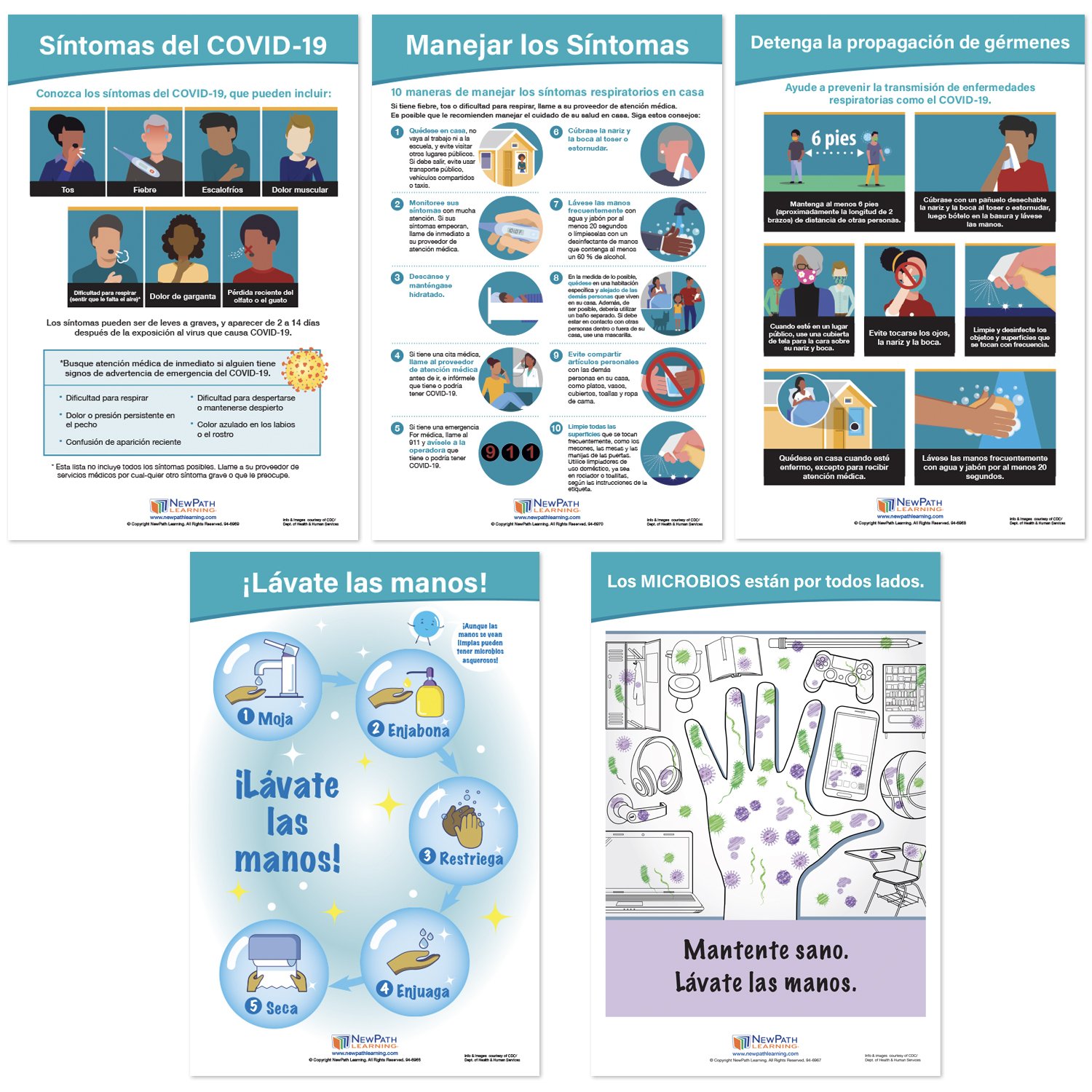 Each 18” x 12” chart is double-sided and laminated. One side provides illustrated safety information in English, and the reverse side in Spanish. Set includes the following 5 double-sided, laminated charts: Symptoms of COVID-19; Managing Your Symptoms; Stop the Spread; Wash Your Hands; and Germs are all Around You!