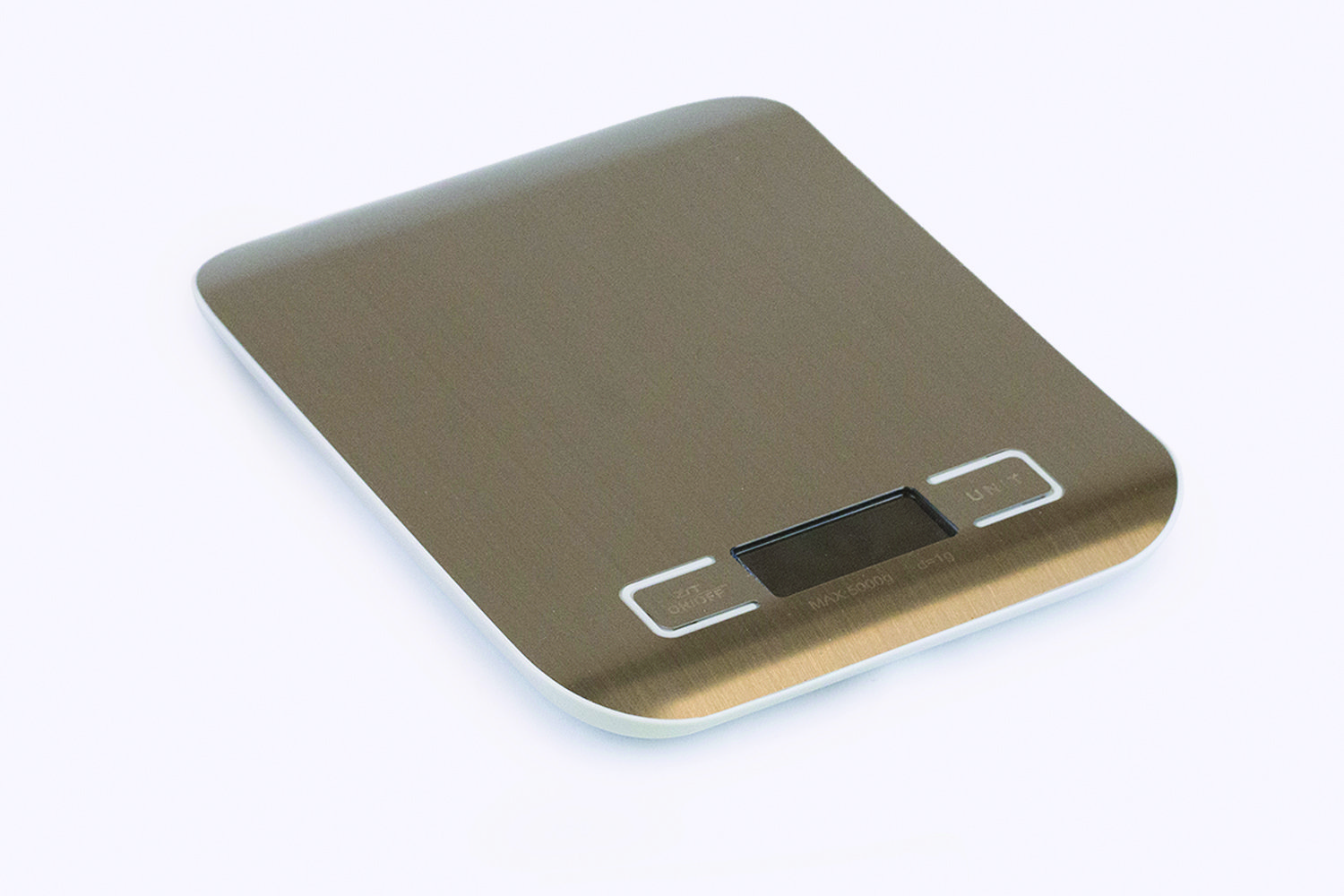 Digital kitchen scale with 5000 g capacity, 1 g readability, stainless steel platform, and tare function. Ideal for food science and classroom experiments.