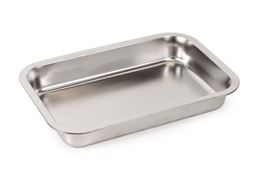 Durable stainless steel dissecting pan measuring 12" x 8.5" x 2", designed for laboratory and classroom use. Pan only; wax or pad not included.