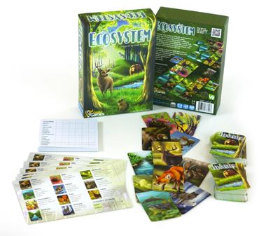 Ecosystem is a biologically derived card drafting game. Player choose, pass, and arrange eleven different card types consisting of organisms ranging from bees to bears and environments like streams and meadows. Earn points by aligning animals with habitats where they most flourish.