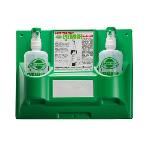 Emergency Eye Wash Safety Station, 2 Bottles, 1000 ml (x2). his fluid delivery system features a built-in eye cup that allows the injured person to be treated in any position, whether standing, sitting, or lying down and provides effective and immediate eye irrigation. Shipped with empty bottles; can be filled with your favorite Sterile Eye Wash Solution Refills