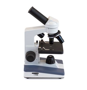 Three objective lenses magnify from 40X to 400X when used with the included 10X eyepiece. Focusing is easy with one coarse focus knob. LED illumination is powered by three AA batteries or the included external power supply. Adjust the brightness using the disc diaphragm and keep slides in place with sturdy spring-loaded slide clips.