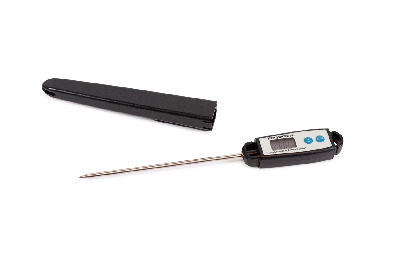No more worries about broken thermometers or spilled mercury! Now you can get a safer alternative that won’t bust your budget—the Flinn digital pocket thermometer! Our new digital thermometer is compact, waterproof and easy to use. The shorter length (4¾") probe and lightweight (36 g) design allows you to take temperatures in test tubes, flasks or even small beakers with little chance of tipping them over. Features include an on/off switch, ºC/ºF button, data hold button, 0.7-second sampling rate and automatic shutoff after 10 minutes. Stainless steel probe fits in its own plastic case with a pocket clip. 8" overall length. Uses one 1.5-volt battery, included.