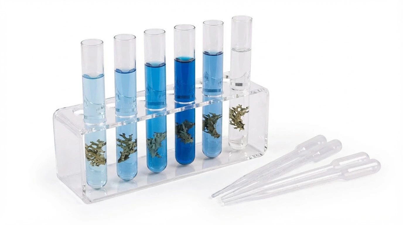 Materials: Kit includes methylene blue solution, potassium chloride solution, sodium chloride solution, copper(II) chloride solution, cobalt chloride solution, iron(III) chloride solution, foliose lichen, gauze, and culture tubes.