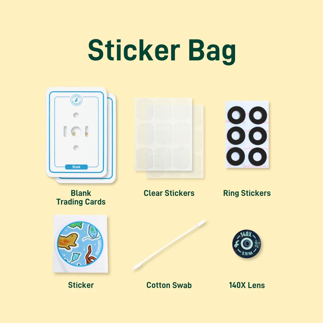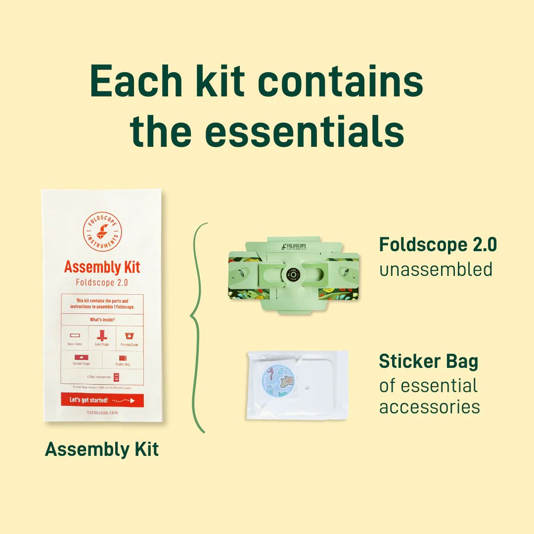 Perfect for classrooms, this kit includes 20 Foldscope 2.0 microscopes with 140× lenses, phone couplers, slides, and shared tools.