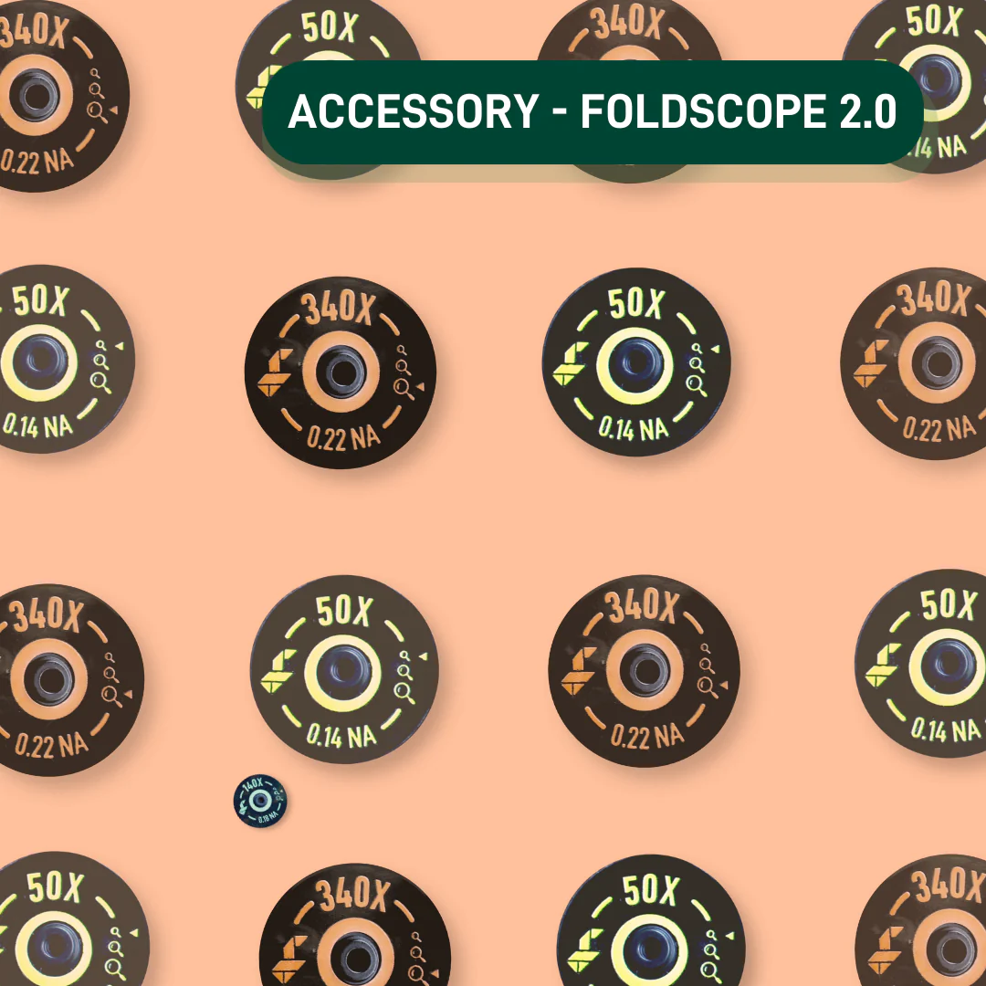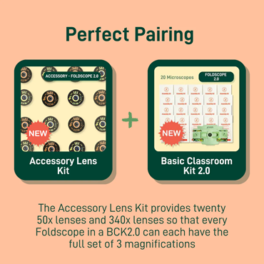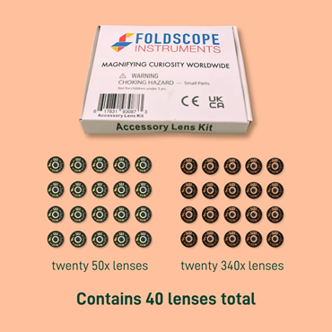 Magnification: 50×, 140×, 340×, Lens Type: Magnetic interchangeable lenses, Compatibility: Designed for Foldscope 2.0, Kit Contents: 3 microscope lenses with magnetic holders, Target Audience: Advanced users, Foldscope upgrades, microscopy enthusiasts.