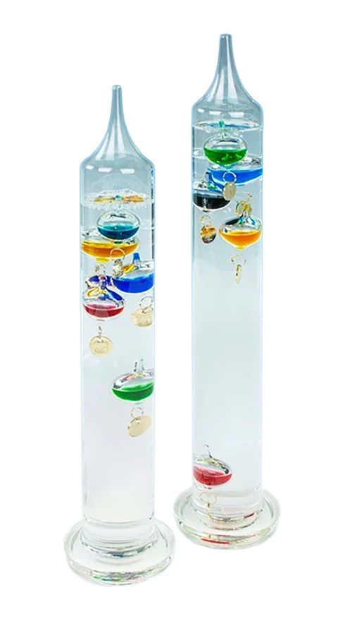 Add some color and fun to your lessons on specific gravity with a colorful and dramatic Galileo thermometer. Galileo Galilei (1564–1642) succeeded in developing a thermometer based upon the law of physics which states that the specific gravity of liquids changes as they expand at different temperatures. Add multicolored liquids in sealed bulbs in a large sealed tube and you have a captivating permanent demonstration of this important principle. Each bulb in the thermometer is partially filled with a different colored fluid and a metal tag beneath it with a printed Fahrenheit temperature. The bulbs are in continual motion up and down the column as the temperature changes. The current actual temperature is indicated by the lowest floating sphere in the upper part of the cylinder.