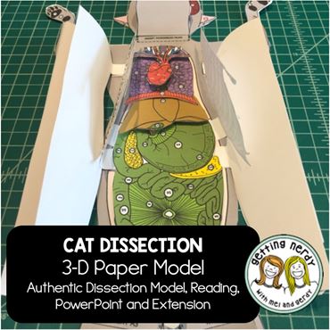 The Getting Nerdy® Science 3D Scienstructable cat dissection model can be used as dissection-free exploration, predissection tools or summative assessments for comparative anatomy. Each model includes 36 editable PowerPoint slides with bellwork, instructions, and embedded handout answer keys and 40 PDFs of handouts, guided reading, differentiated graphic organizers and dissection templates in black line and color. Time required: 4–5 days.