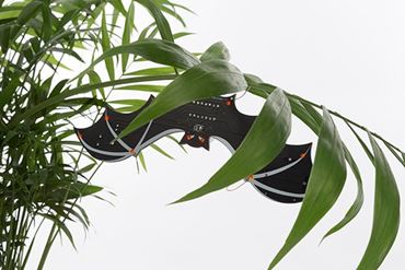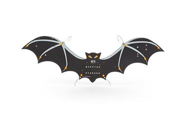 This Halloween gadget looks like a creepy bat and has a matte black color with white coating. The circuit board features 4 holes to give the bat claws, or to hang the gadget.