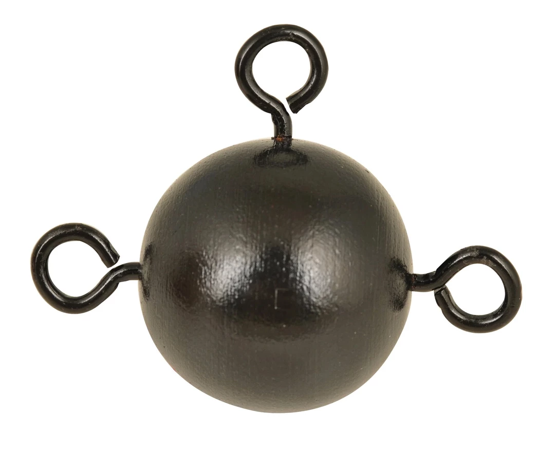 The solid zinc ball weighs 454 grams. Fitted with 3 eye bolts. Eye bolts have 3/8" ID dia .