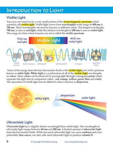 Covers: Introduction to Light; The EM Spectrum; Transmission of Light; Light & Color; Interactions with Light; Reflections & Mirrors; Refraction & Lenses; Light & the Human Eye; and Light in Technology.