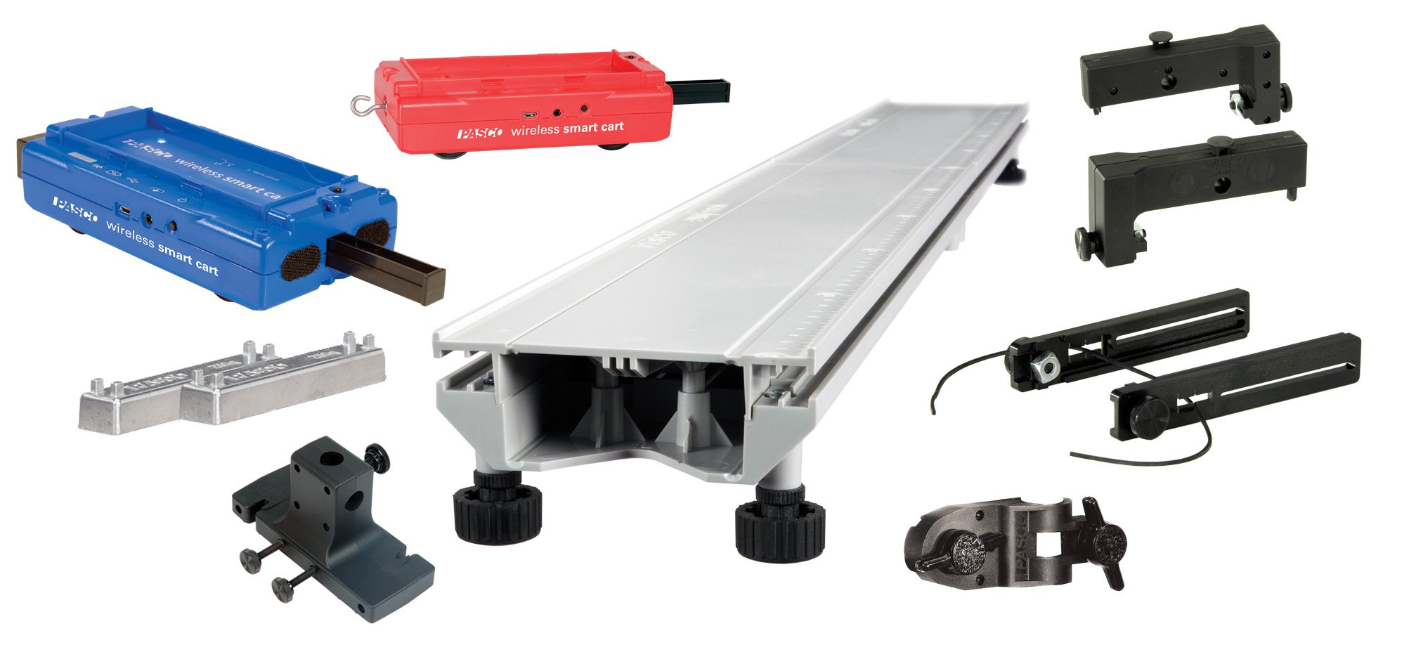 This configuration includes two Wireless Smart Carts (one red and one blue) and a plastic PAStrack dynamics track. The accessories package is not included.