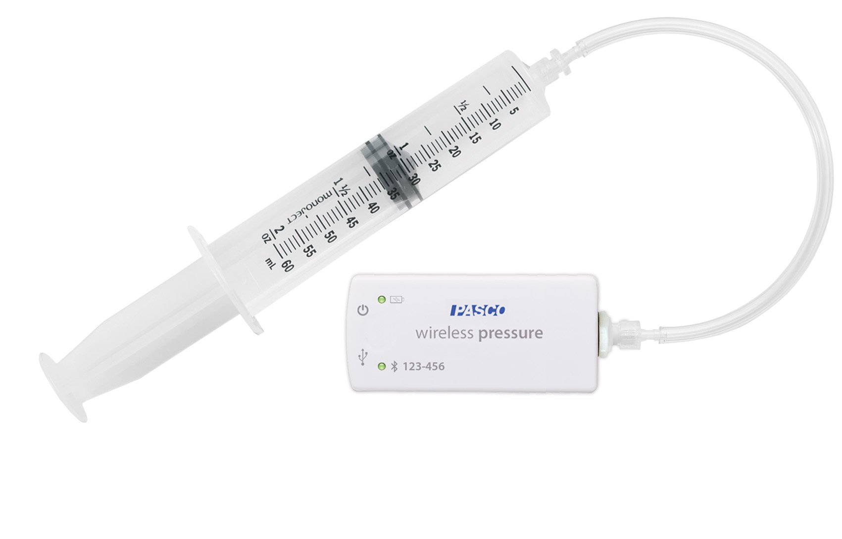 The Wireless Pressure Sensor allows students to easily collect accurate gas pressure data for a wide range of applications. Included is a 60-cc syringe, tubing, and connectors that facilitate experiments such as Boyle's Law, measuring pinch-grip strength, and measuring hydrostatic pressure in water. Within PASCO software, students can easily select their desired units from a list containing kPa, mmHg, inHg, mbar, psi, atm, and torr.