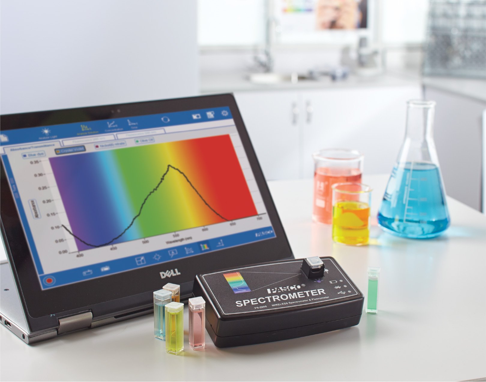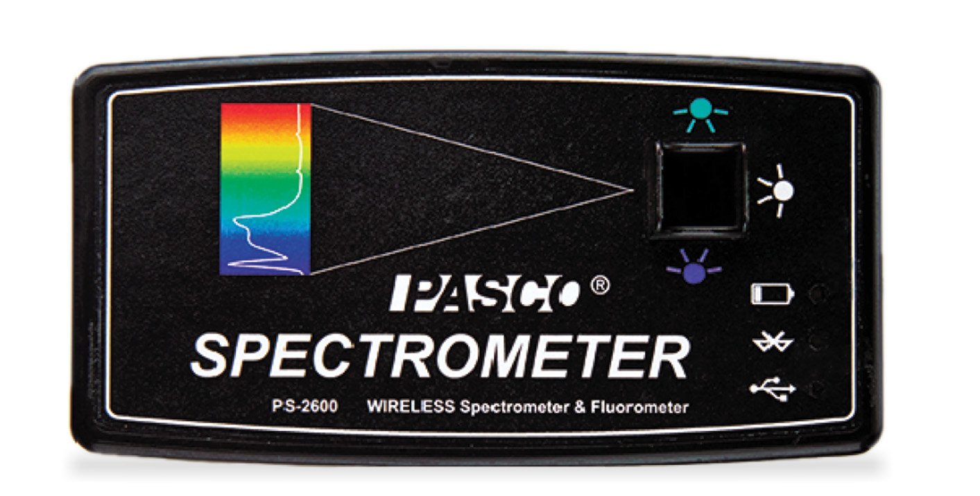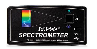 The PASCO Wireless Spectrometer is specifically designed for introductory chemistry, biology, and physics labs. It pairs effortlessly with student devices (Mac®/Windows®, Chromebook™, iPad® and Android™ tablets) via Low Energy Bluetooth® (BLE) or USB and includes free PASCO Spectrometry Software for easy operation. Scan times are fast, ranging from milliseconds to minutes depending on the experimental settings. This enables students to quickly gather absorbance spectra across the visible spectrum. After specifying a target wavelength, students can select a display to compare absorption to concentrations (Beer's Law), track rates of reactions (kinetics), or investigate emission spectra using the optional Fiber Optic Cable accessory. Measures intensity, absorbance, and transmittance across the visible spectrum. Includes fluorescent excitation at 405nm and 500nm.