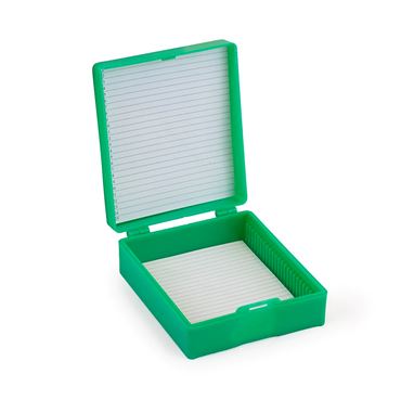 Durable molded plastic slide storage box that will withstand day-to-day student use. The 25-slide box is convenient for class sets of a specific slide. The 100-slide box serves as an airtight, permanent storage container. The internal dividers keep the slides safely separated and the overlapping cover holds them in place. You can protect 25-100 slides for the price of one replacement slide!