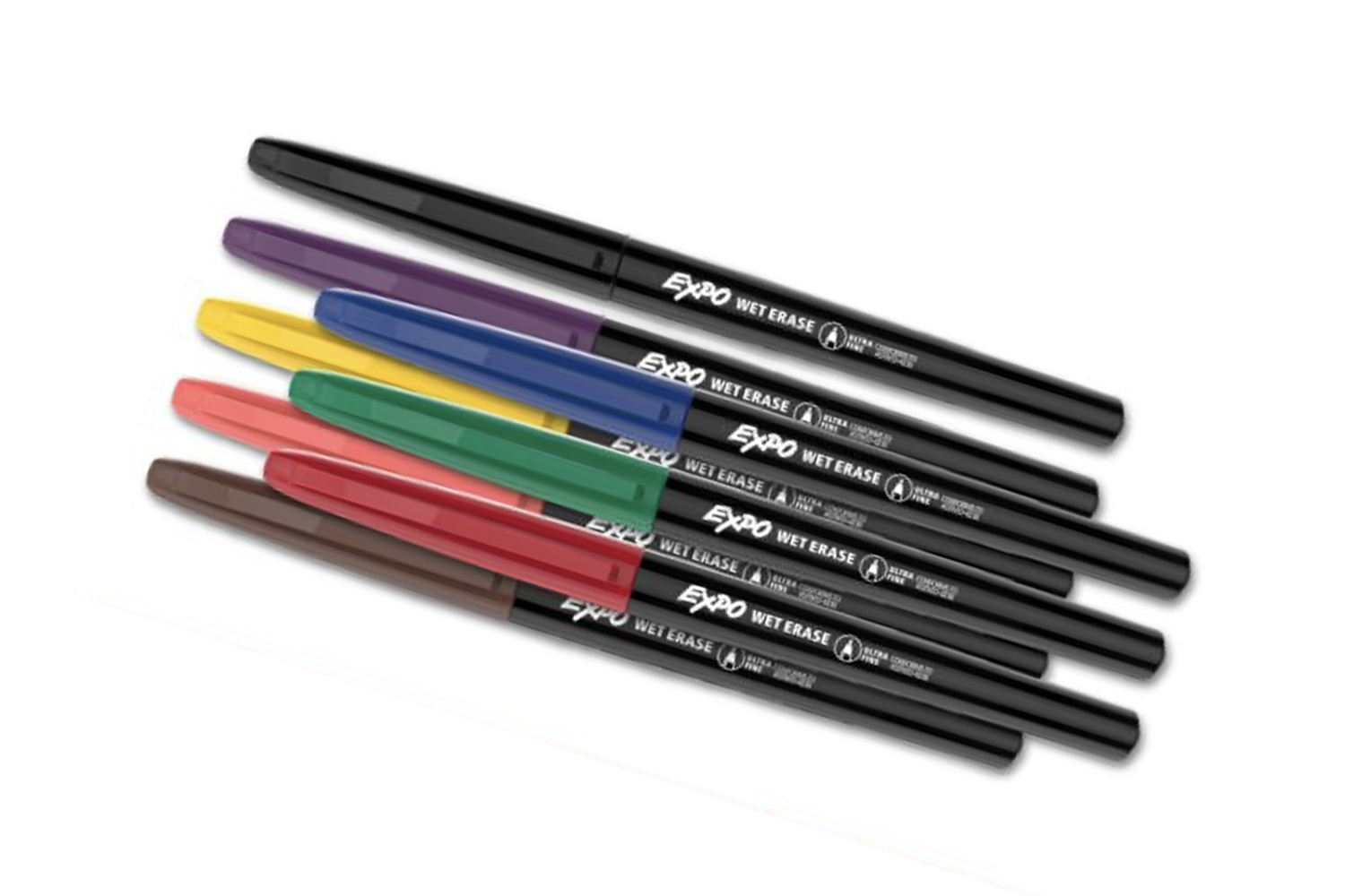 Felt tip and chromatography pens. Pens come in red, orange, yellow, green, blue, purple, brown and black with the option of being water soluble (transparency pens) or alcohol soluble (permanent markers).