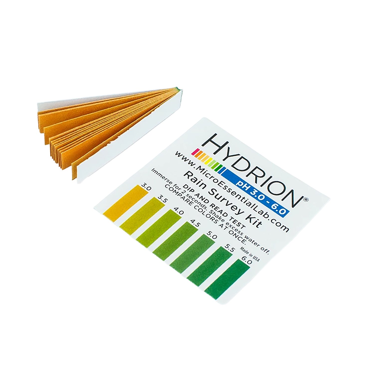 Acid rain test paper contains 15 strips of pH test paper and a color comparison chart-designed for measuring the pH of rain In the range of 3.0 to 6.0. A student taking an acid rain survey can take readings on 15 samples.