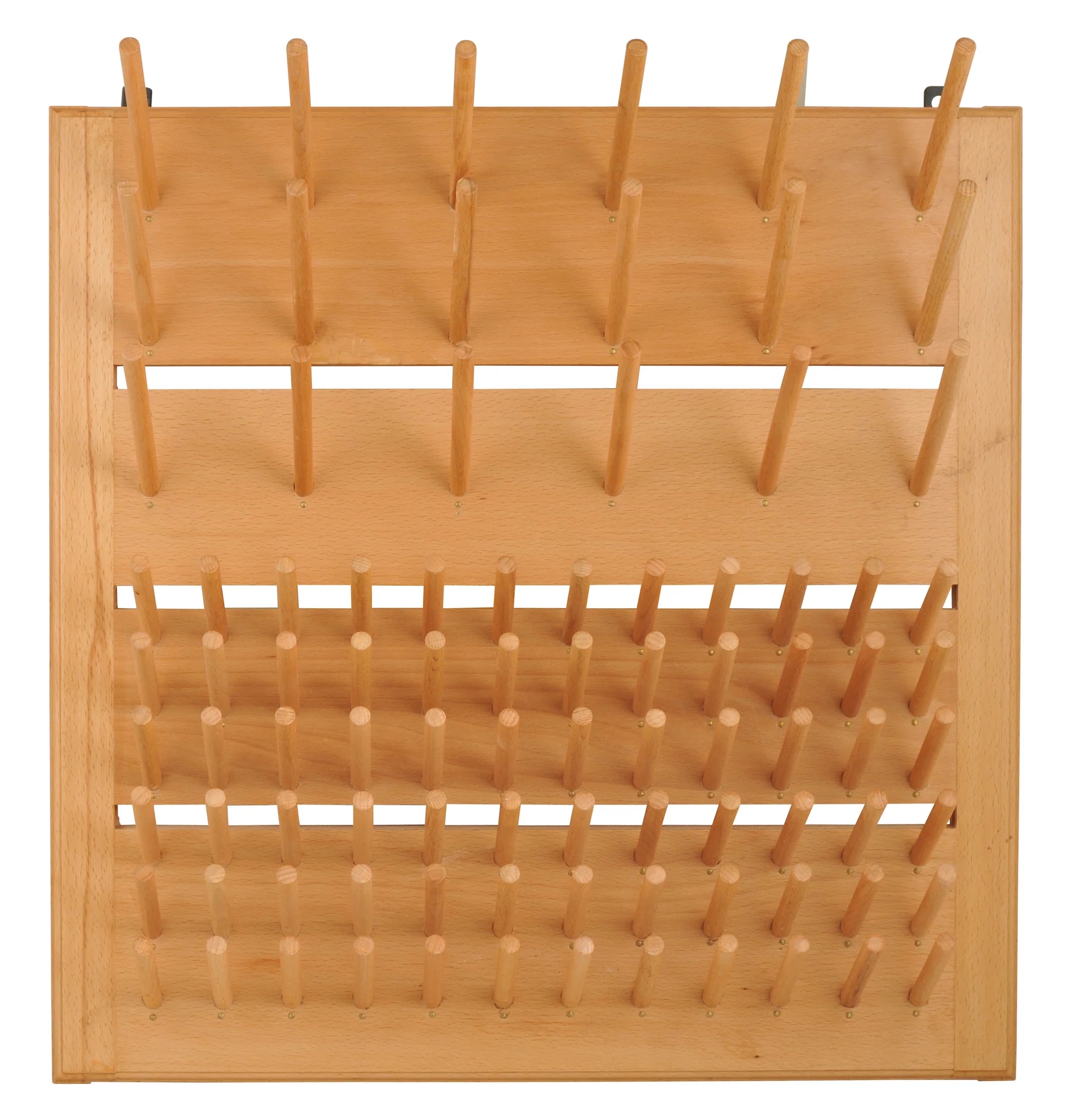 Drying rack studded with 18 pins (127 mm long) and 72 pins (76 mm long). Overall dimensions are 508 × 508 mm. Complete with hangers for mounting on a wall. All hardwood, including the pegs. This well-made product will last a lifetime.