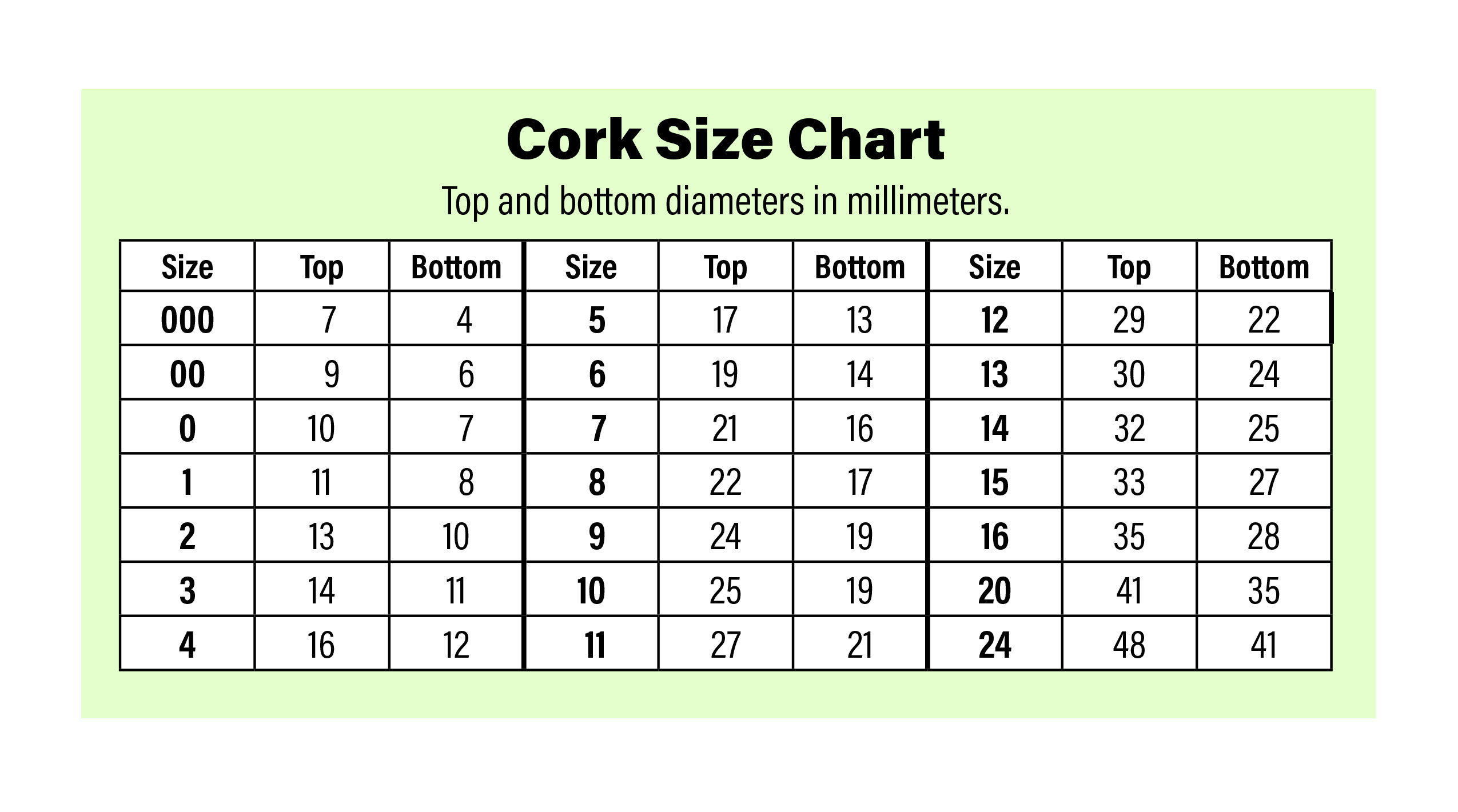 Size | 000 | 00 | 0 | 1 | 2 | 3 | 4 | 5 | 6 | 7 | 8 | 9 | 10 | 11 | 12 | 13 | 14 | 15 | 16 | 20 | 24 |