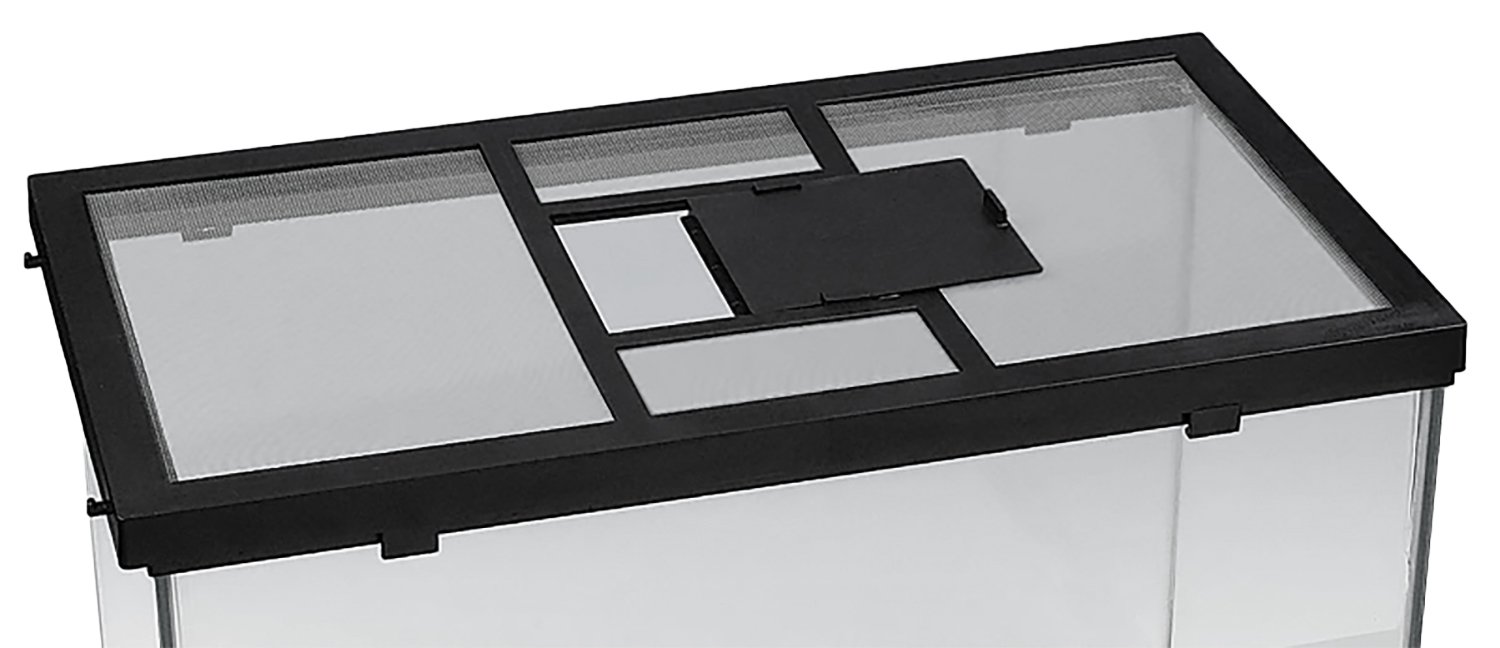 These durable, secure screen covers are an effective and economical way to increase the versatility of your aquarium tanks by converting them for use as vivariums. Feature heavy-duty, impact-resistant, black frames with tough, corrosion-resistant mesh screening. Mesh allows total ventilation for maximum comfort for your animals. Covers are secured to the tank with two screw-lock mechanisms—preventing them from being pushed or bumped off. The two sizes listed are available with convenient, self-locking, sliding doors. Doors measure 5" x 6" and permit access without removing the cover. The 24" x 12" cover (without the door) will fit a 30-gallon River Tank.