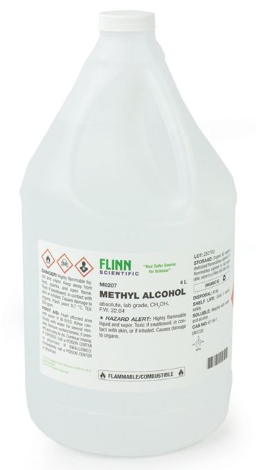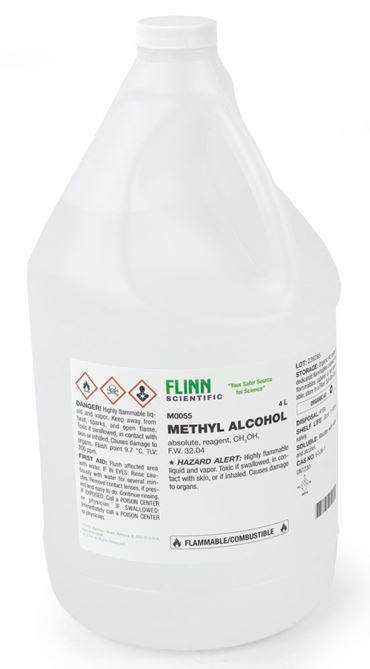Flammable; dangerous fire risk; toxic by ingestion (ingestion of as little as 15 mL has caused blindness). TLV 262 mg/m3. LD50 5628 mg/kg. SPECIAL HAZARD ALERT: Laboratory accidents involving methyl alcohol occur when vapor in the air ignites and travels back to the source, causing a flash fire. Always cap the bottle of methyl alcohol and remove it from the area prior to performing any demonstration involving open flames, sparks or heat. Use only a small amount and always perform demonstrations behind a safety shield. Please call or email us to request Flinn Safety Fax Publication No. 10497, Methyl Alcohol Safety, for more detailed safety information and instructions.