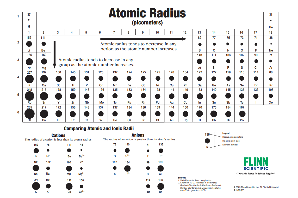 The Atomic Sizes and Radii Chart for chemistry classrooms is arranged in an easy-to-read format, allowing students to study the relationship between the atomic number and the size of an atom with ease.