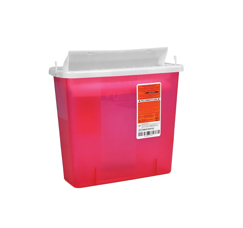 Safely dispose of used, contaminated medical sharps in this affordable enclosure. Unique lid design facilitates one-handed disposal, and container’s horizontal design allows for maximum capacity to fill line. Grooves allow the lid to be tightly secured onto the base. Once locked, the container should not be able to be re-opened. Easy-to-see fill lines allow you to know when it is time to dispose of the sharps properly in accordance with local regulations. 5-qt.