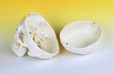 Skull Model for anatomy studies is a life-size model of a normal human skull that accurately presents numerous anatomical details including all major sutures, fissures, joints, and more.