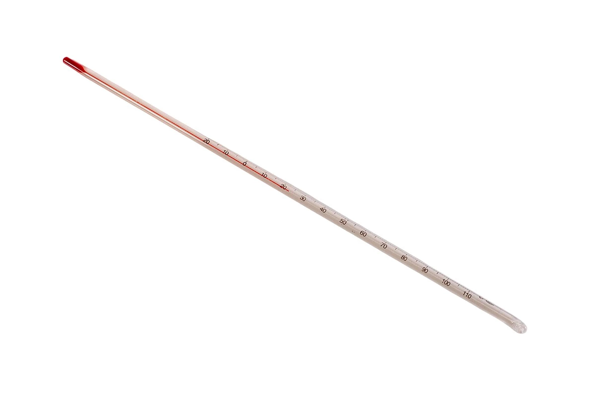 Non-mercury, spirit-filled laboratory thermometer with a –20 to 110 °C range. Partial immersion design calibrated for 76 mm (3") immersion depth.