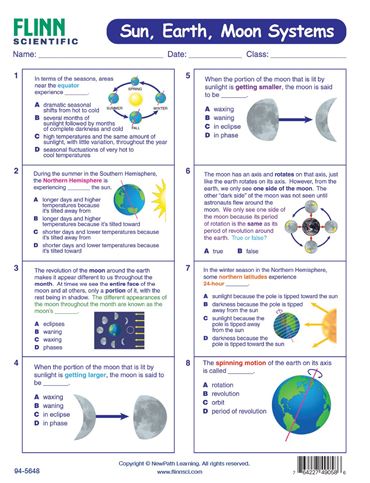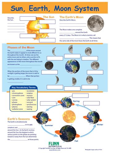Sun, Earth & Moon Systems Visual Learning Guide provides comprehensive coverage. Each 11" x 17" laminated Write-On/Wipe-Off guide includes four panels of helpful information to engage students in the study of this topic.