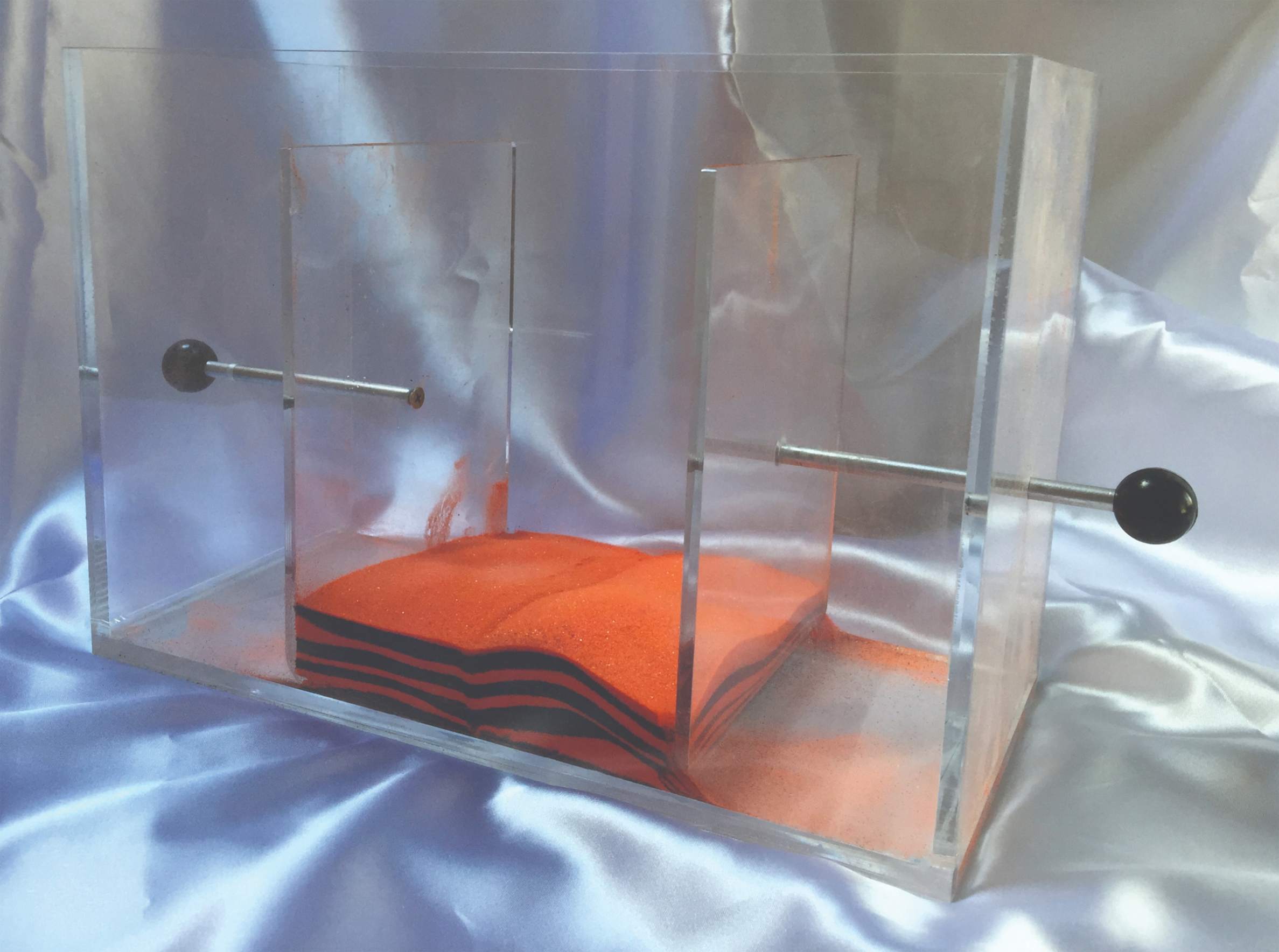 This 3-D model demonstrates plate tectonic principles, plate boundary interactions and the geometry and relative motions of faulting of geologic layers.