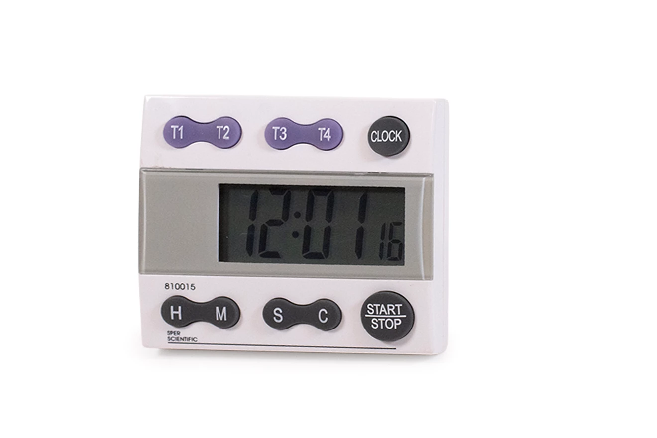 The timer with clock is a versatile quartz digital timer that is useful to have In the laboratory. The timer comes with a 1.5 volt battery.