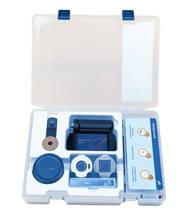 The uHandy Starter Kit transforms your smartphone into a portable microscope. It features a high-precision plastic Lo-Mag lens with direct optical magnification of 10–60× and app-assisted magnification up to 300×. The resolution is 3.6 micrometers, with a 5 mm field of view. The lens attaches securely using a silicone pad clamp and aligns easily with your phone’s camera. Compatible with iOS and Android devices, the kit includes a Lo-Mag lens, ring light, Lo-Mag extension stage, three mini petri dishes (sample caps), 18 flat and 18 bubble sampling stickers, a carrying pouch, 20 ziplock bags, two droppers (0.2 ml and 0.5 ml), two plastic tweezers, two 5 ml centrifuge tubes, one petri dish (35 mm and 60 mm), two batteries, 12 sample hubs, and a field journal for observations.