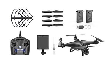 Each kit includes 1 drone, 1 transmitter with phone holder (AA batteries not included), 2 3.7V 1000mAh Li-po modular batteries with 1 USB charging cable, 2 propeller guards, 4 extra propeller blades, 2 extra landing feet, 4 extra motor gears, 2 extra light covers, 18 screws, 1 screwdriver, and 1 manual.