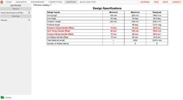 Then it’s finally time to compete in the Arm Toss Competition! In this competition portion of the activity, students see how their designs measure up against each other. After completing their design and applying any improvements, the Outputs section creates a drawing for a physical build of the prosthetic arm. A drawing, design specifications report and bill of materials can be found in this section. Now that students have conquered the virtual world, it’s time to Build and Test the prosthetic arm in the physical world. Using the included materials, students use the instructions and tips in this section to build a physical representation of their design.